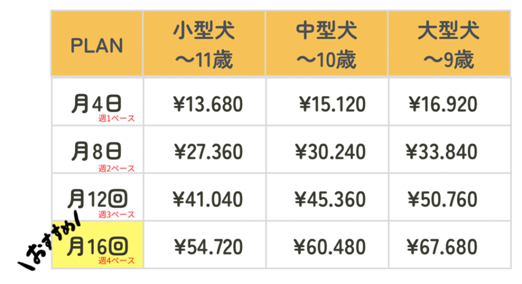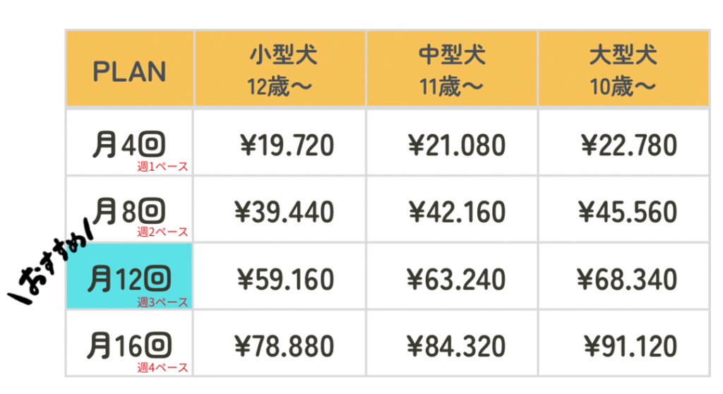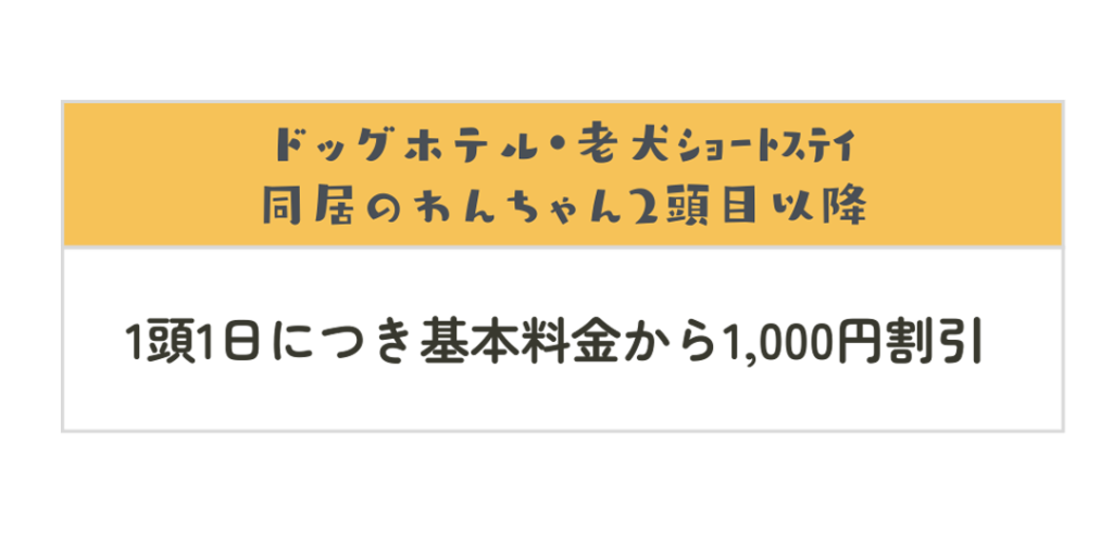 小型犬12歳~、中型犬11歳~、大型犬10歳~はシニア料金(老犬ホーム or 老犬ショートステイ)。